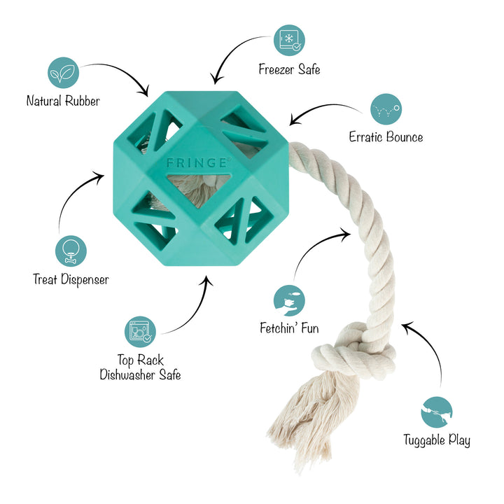 Ready to join the Dura Club? Our "Pull My Way" turquoise rubber dog toy is for pups that love to work for their treats, chew, and play lots of fetch. Made with natural rubber, a treat dispenser, tuggable rope, and an erratic bounce, this toy was created for long-lasting interactive play. Simply toss it for some fetchin' fun or fill it with treats to keep your pup busy trying to get them out!