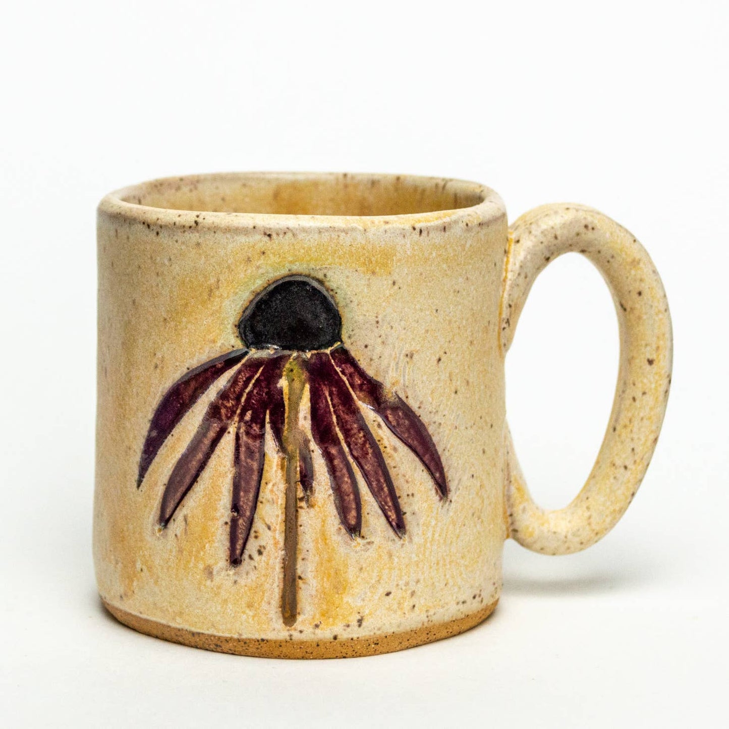 This beautiful handmade in Ohio, stoneware ceramic Purple Cone Flower pattern mug, approximately 10 oz., is hand-built and hand-glazed.