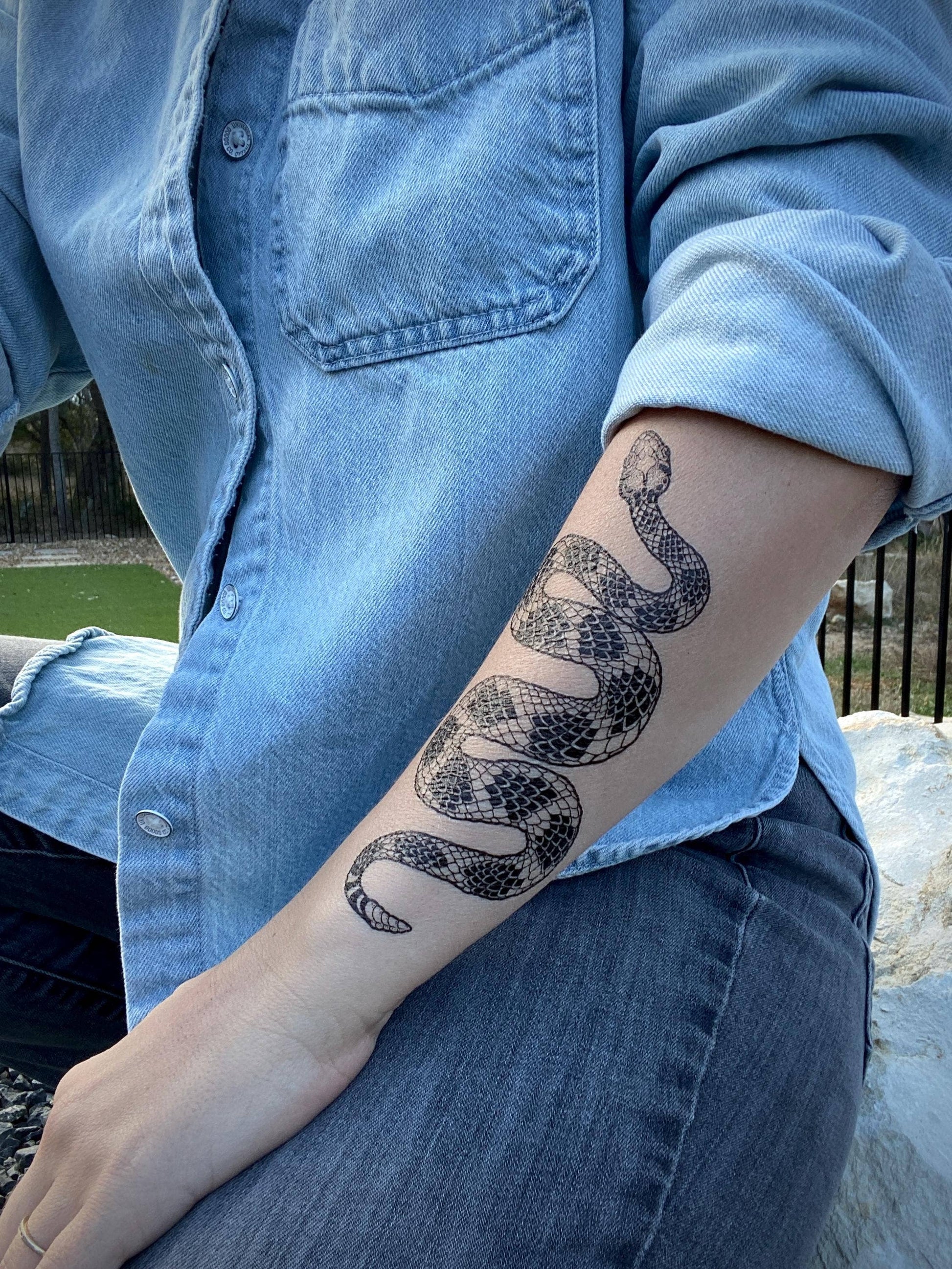 Inspired by the Western Diamondback, this rattlesnake design highlights the strength and resilience of a creature perfectly adapted to its rugged environment. With its signature rattle and striking pattern, the rattlesnake is a powerful yet often misunderstood part of our ecosystem. These snakes help maintain balance by managing populations of small animals and prefer to keep to themselves, only using their venom as a defense. This hand-drawn design is over 6.5 inches long, featuring bold black lines and intricate stippling to capture the essence of this remarkable survivor.