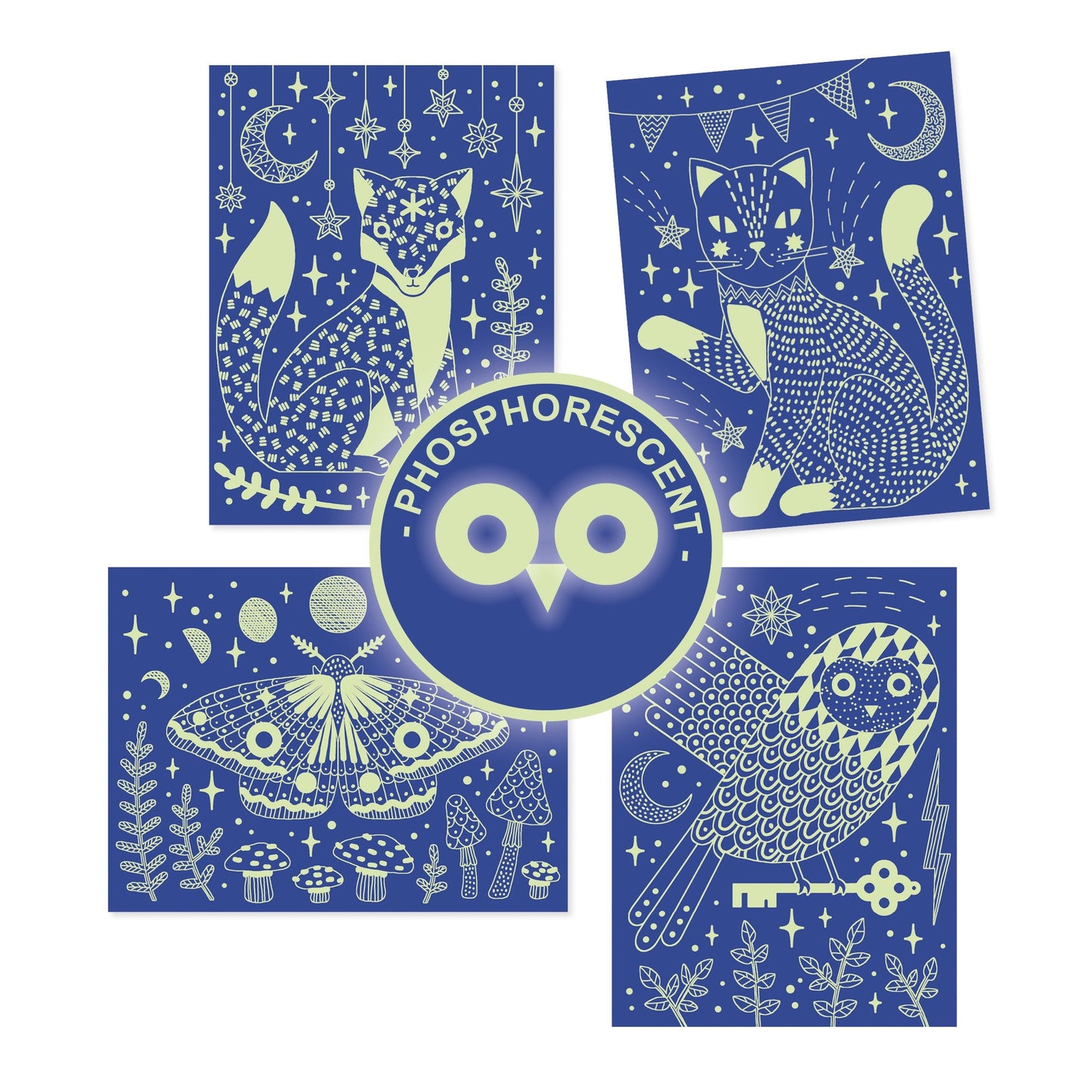 A set of 4 glow-in-the-dark scratch boards featuring nocturnal animals. Children reproduce the patterns designed by the artist by scratching the surface of the board with the wooden stylus. Surprise: in the dark, the animals glow!