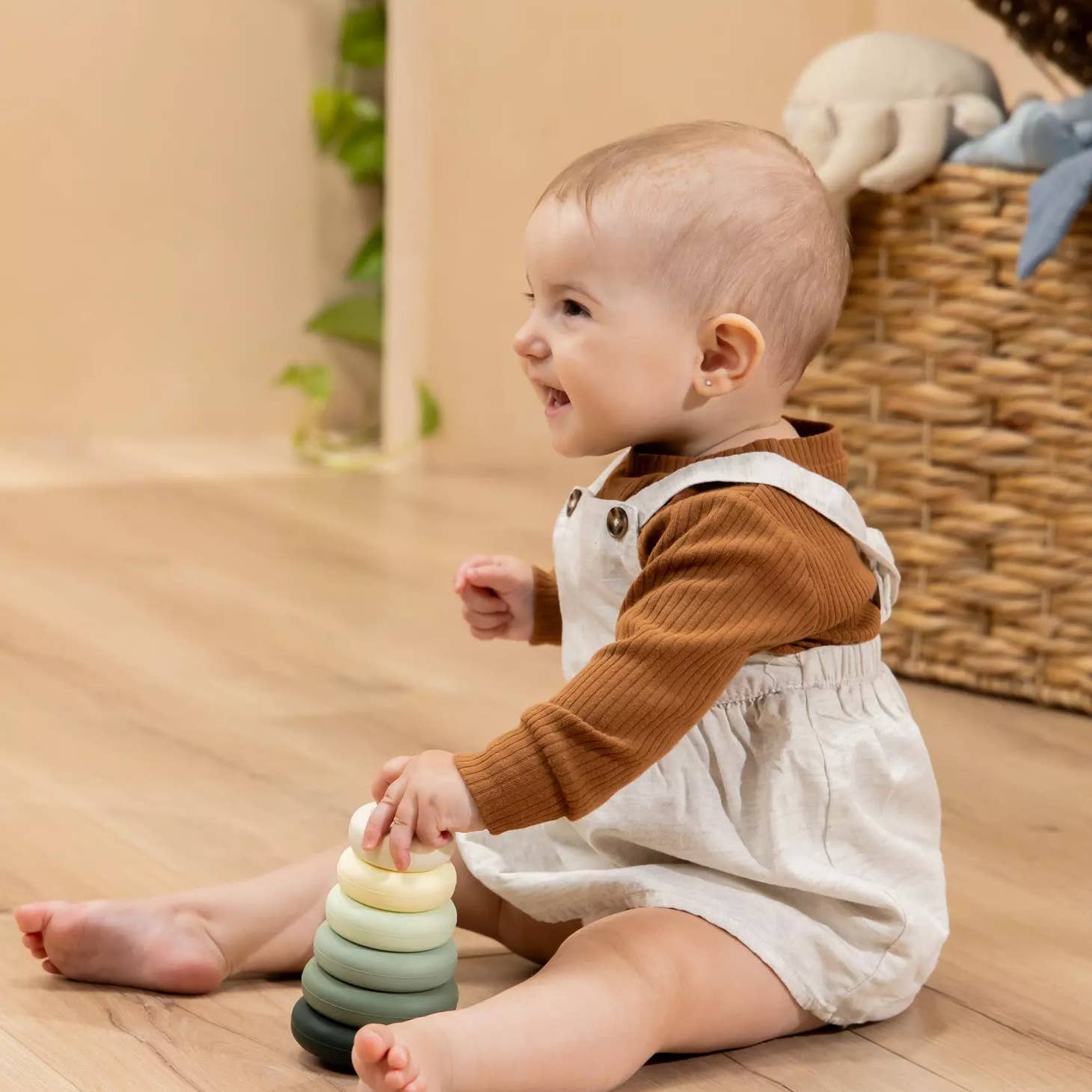 The Set of 6 Silicone Stackable Rings greatly contributes to the motor development as well as the hand-eye coordination of infant. This first exploration for babies will help them discover the world around them, and it is through their senses that they will learn about shapes, colors and textures.
