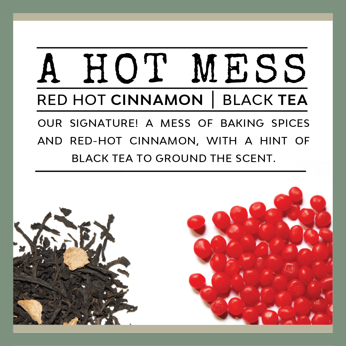 Our signature scent is a mess of baking spices, red-hot cinnamon, and a hint of black tea to calm this scent a bit. Everyone is A Hot Mess, embrace it with us!
