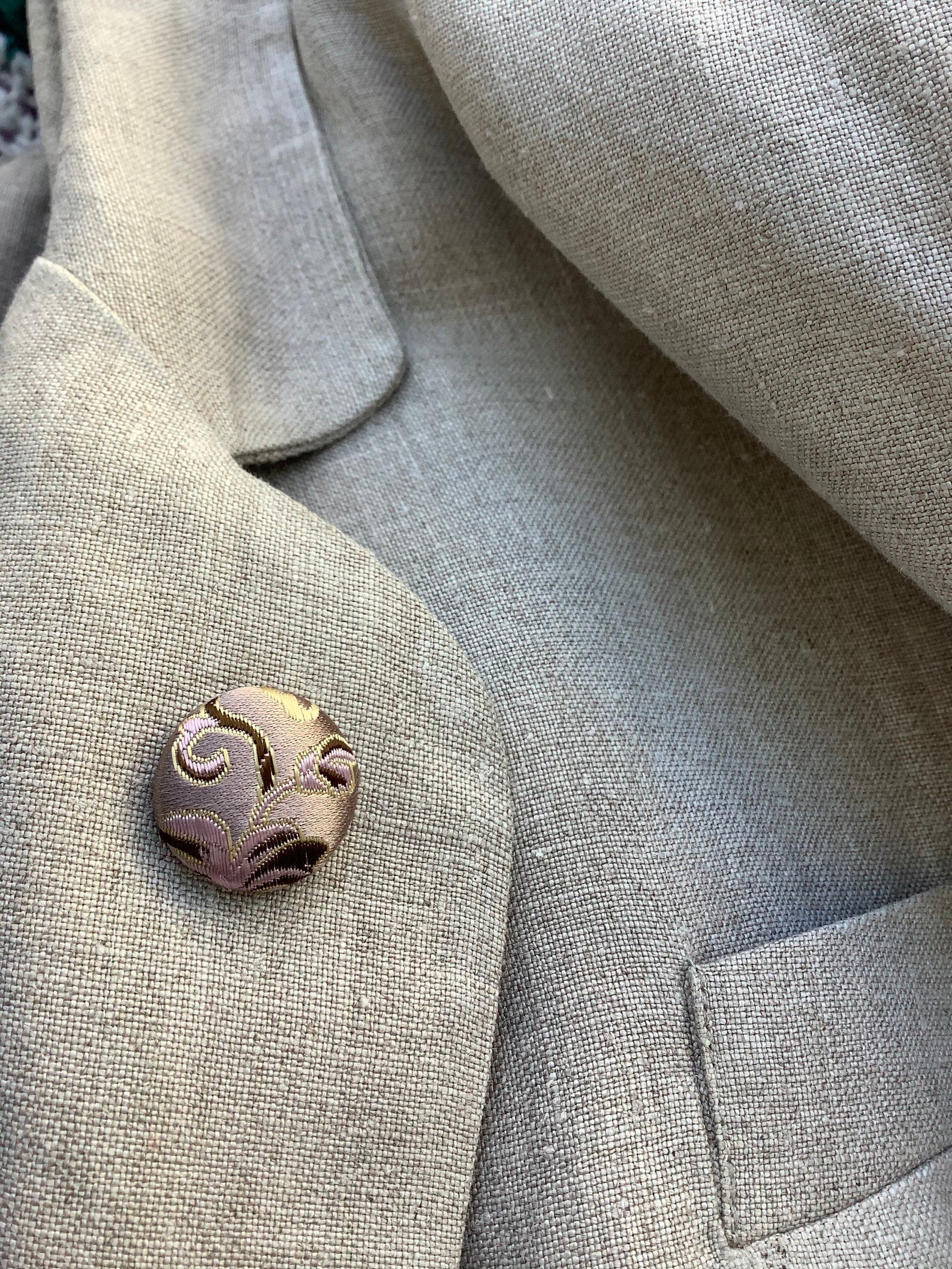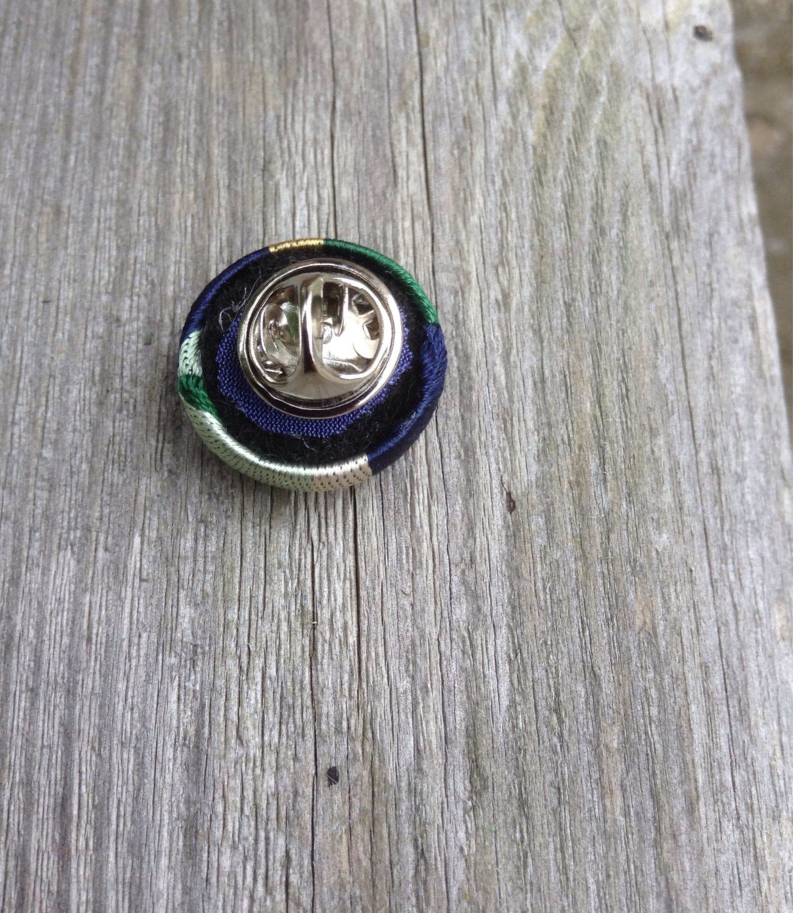 A silk lapel button pin boutonniere for modern guys and women! Exquisite Lapel uses silk to make these 3/4 inch covered buttons, mounting each onto a tie tack finding with a butterfly clutch. Handmade, so each one is a little different! Adds elegance to a suit, sports jacket, cardigan or blazer.
