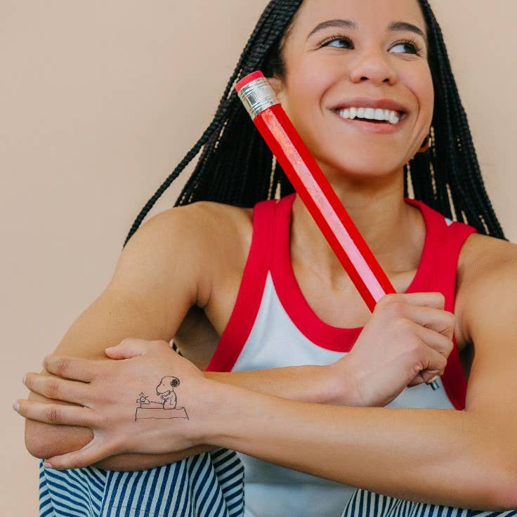 Snoopy Writer Tattoo Pair by artist PEANUTS®. Safety tested, vegan, cruelty free, and made in the US with domestic and imported materials. Tattly Pairs include two of each design.