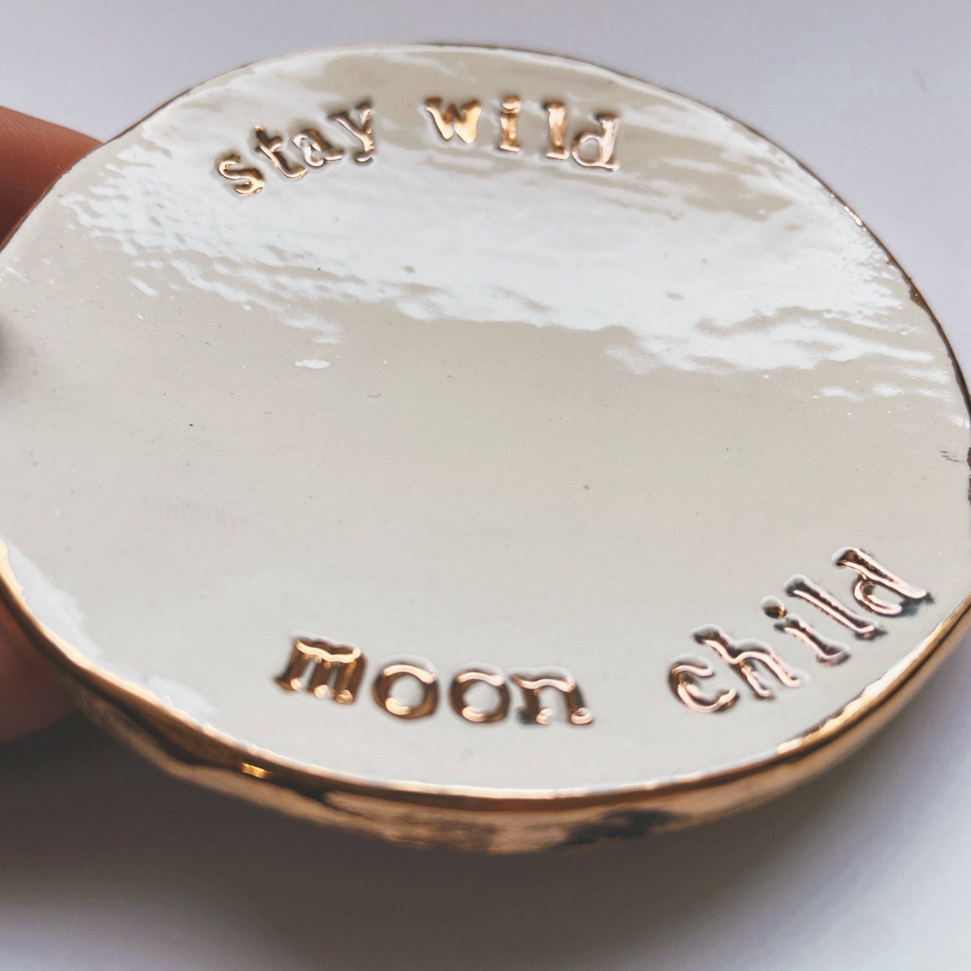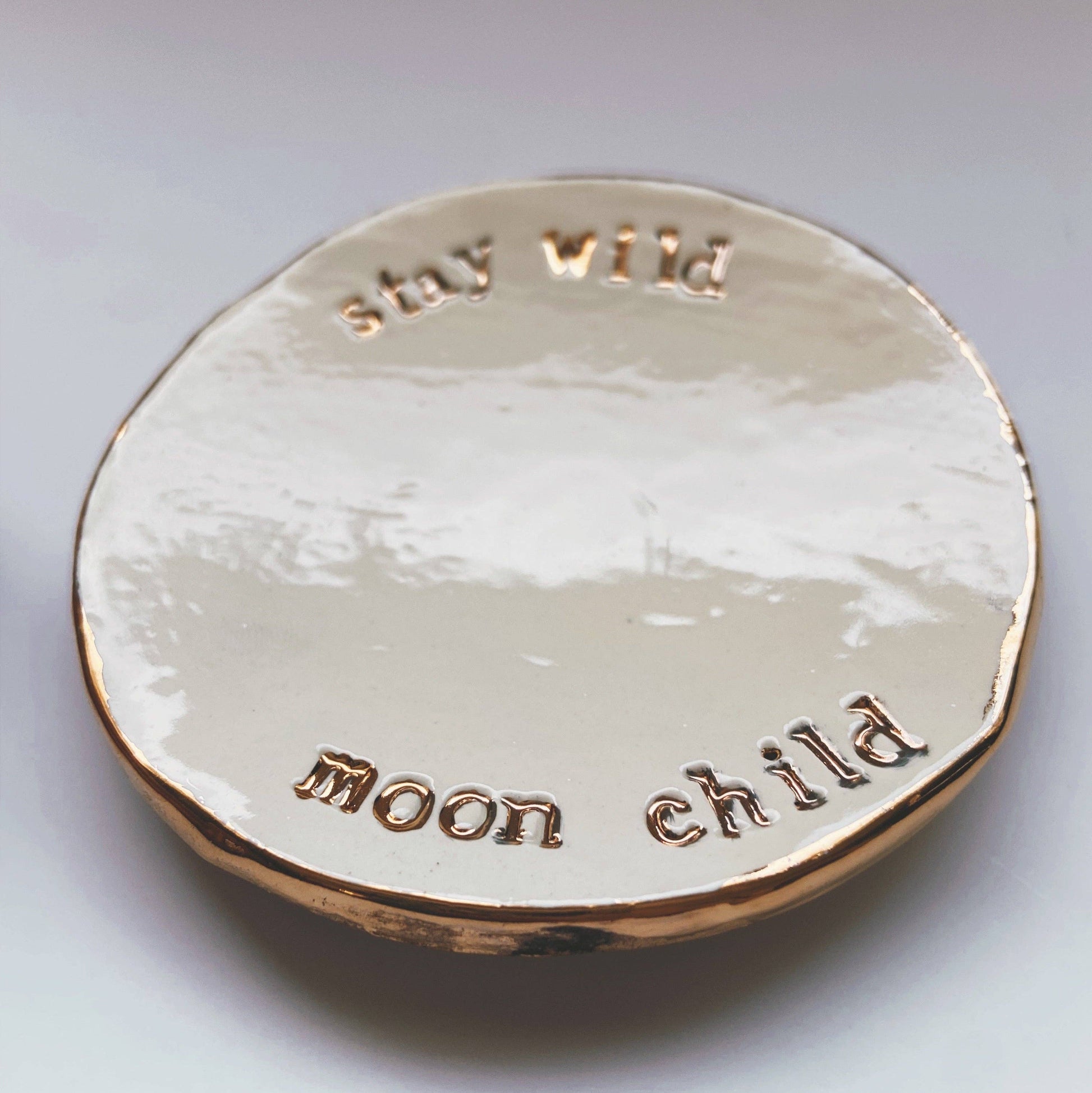 Hand built and hand stamped with 22k gold accent. This little dish is perfect for rings, salt for cooking, or just a fun accent piece in your home.