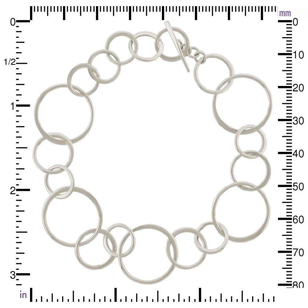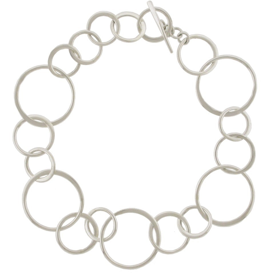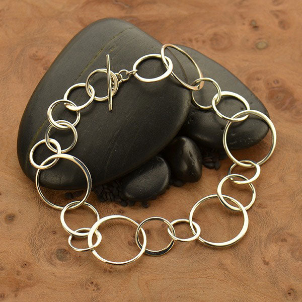 This Handmade Sterling Silver Chain Bracelet is made of three different size circle links in a repeating small to large pattern. Sold per piece. Part of each circle is made of round wire, other side is flattened. Adjust the length by using any of the last four links as the ring for the toggle clasp - adjusts up to 8 inches!