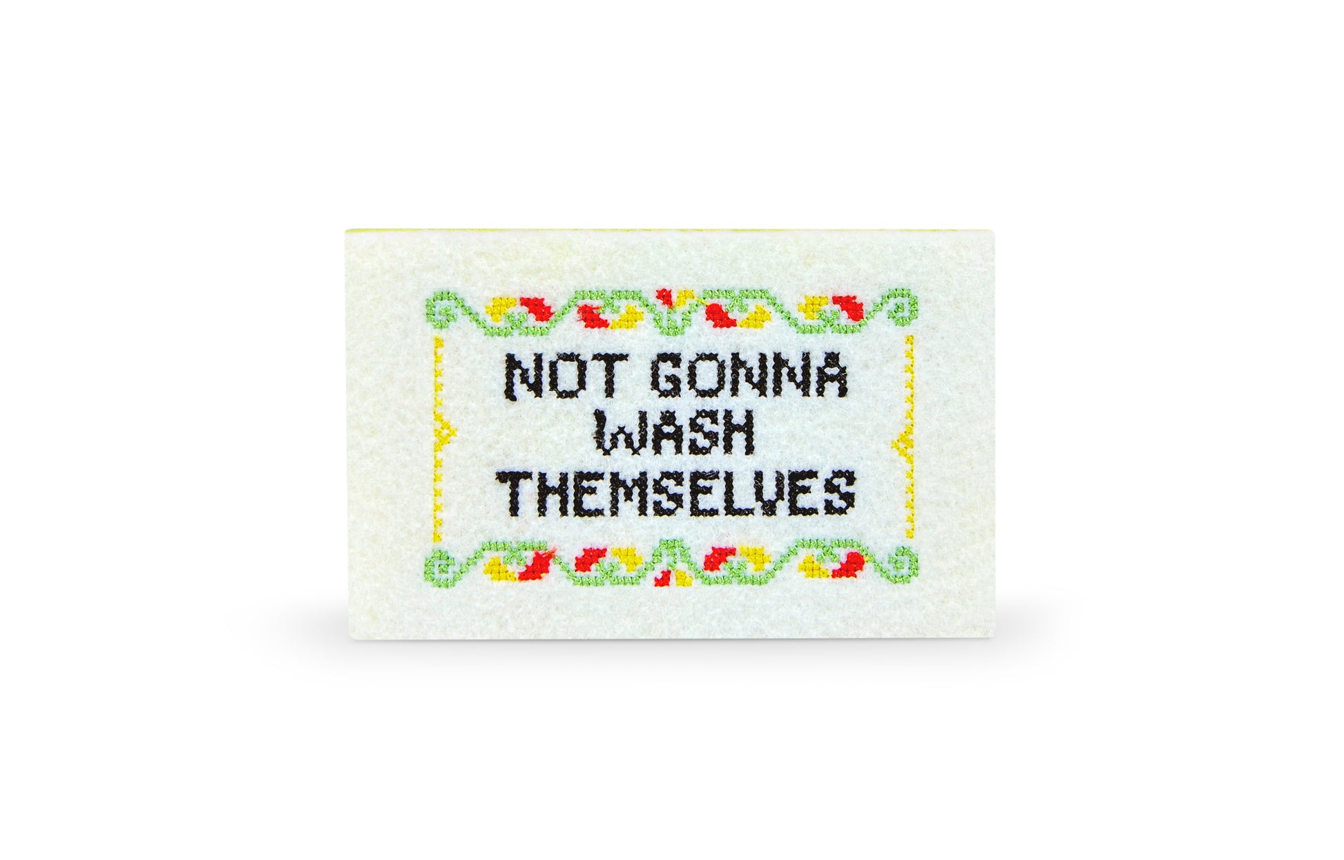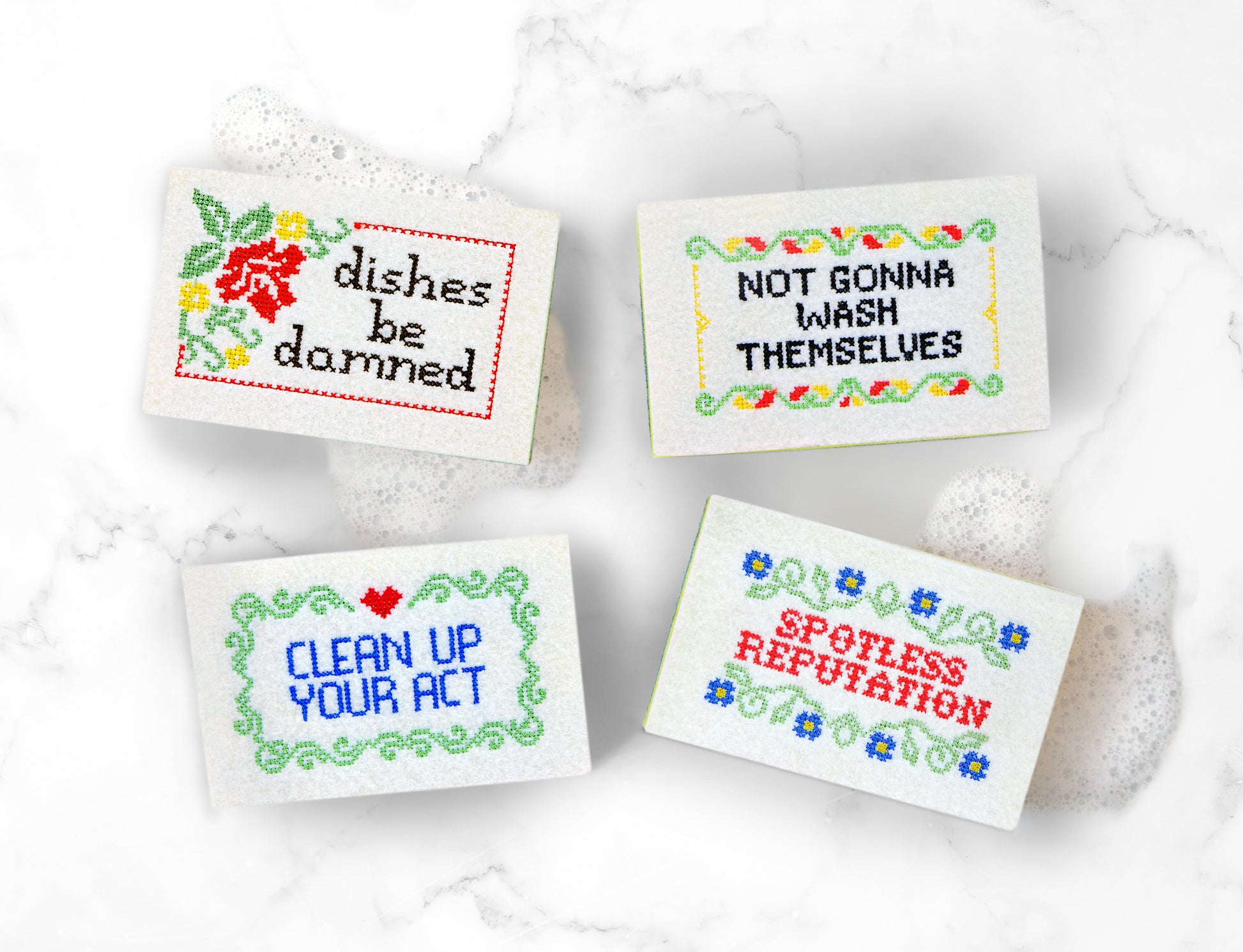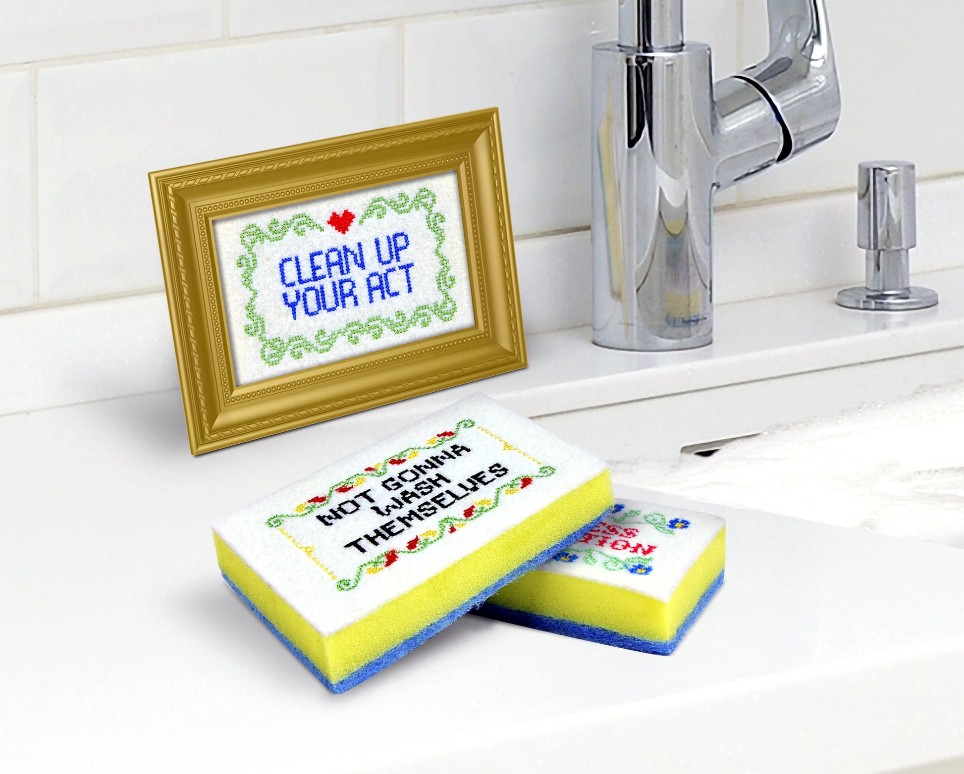 Doing the dishes brings out the surly side in all of us. Show them how you really feel about tedious tasks with Fred's Subversive Sponges. Each set includes 4 unique embroidered poly sponges with a PP gold frame that stands on your countertop or suctions to your sink or tile. Hand wash only. Design by Charlotte Saul from Fred, in cooperation with Subversive Crossstitch.