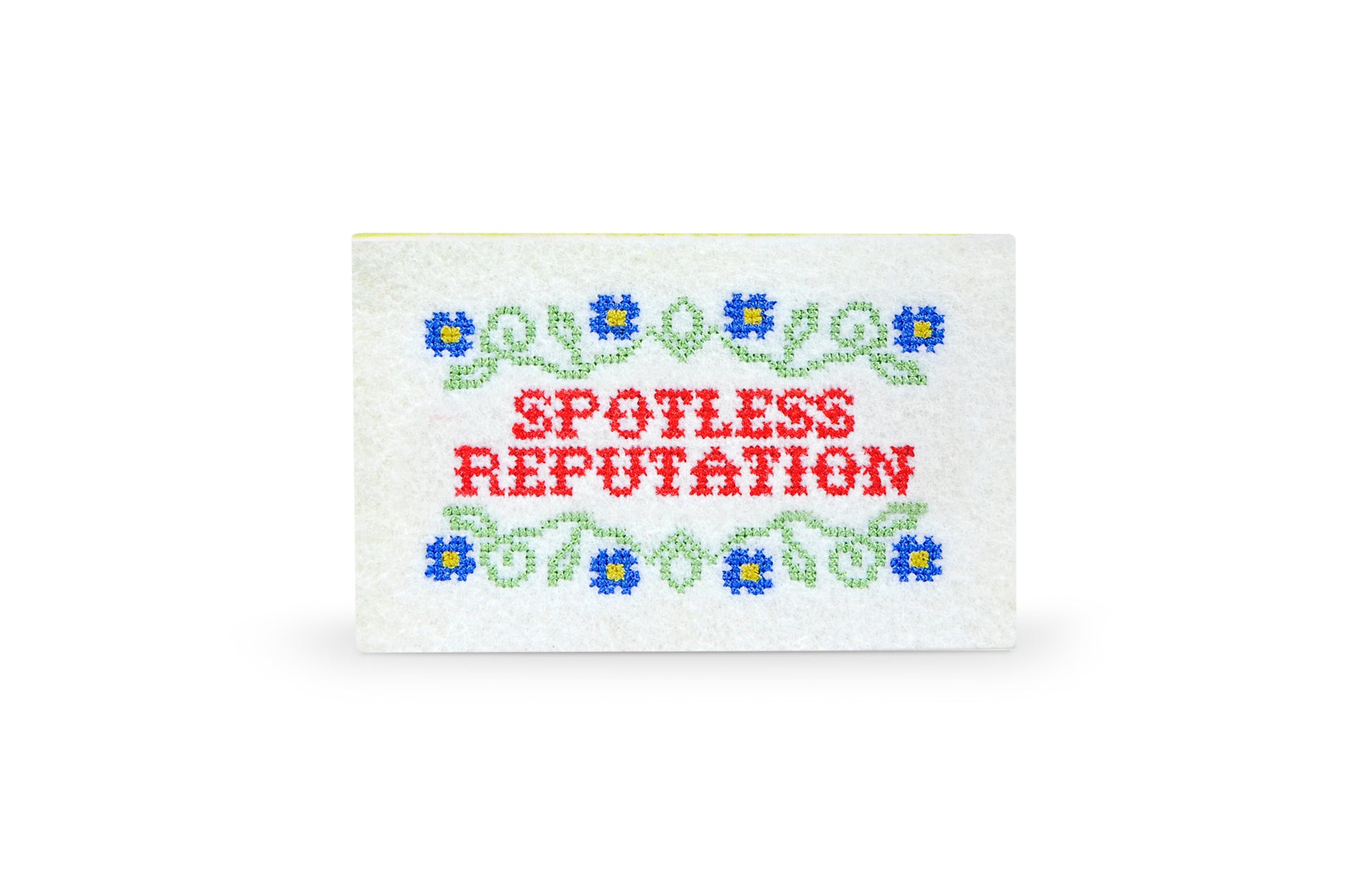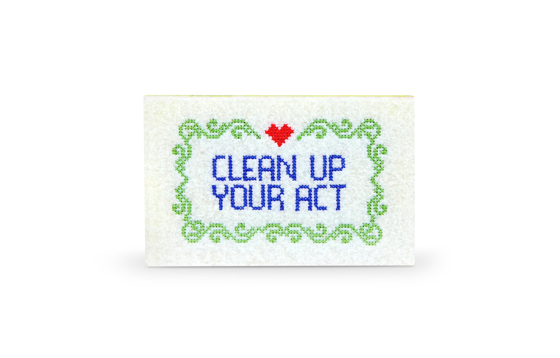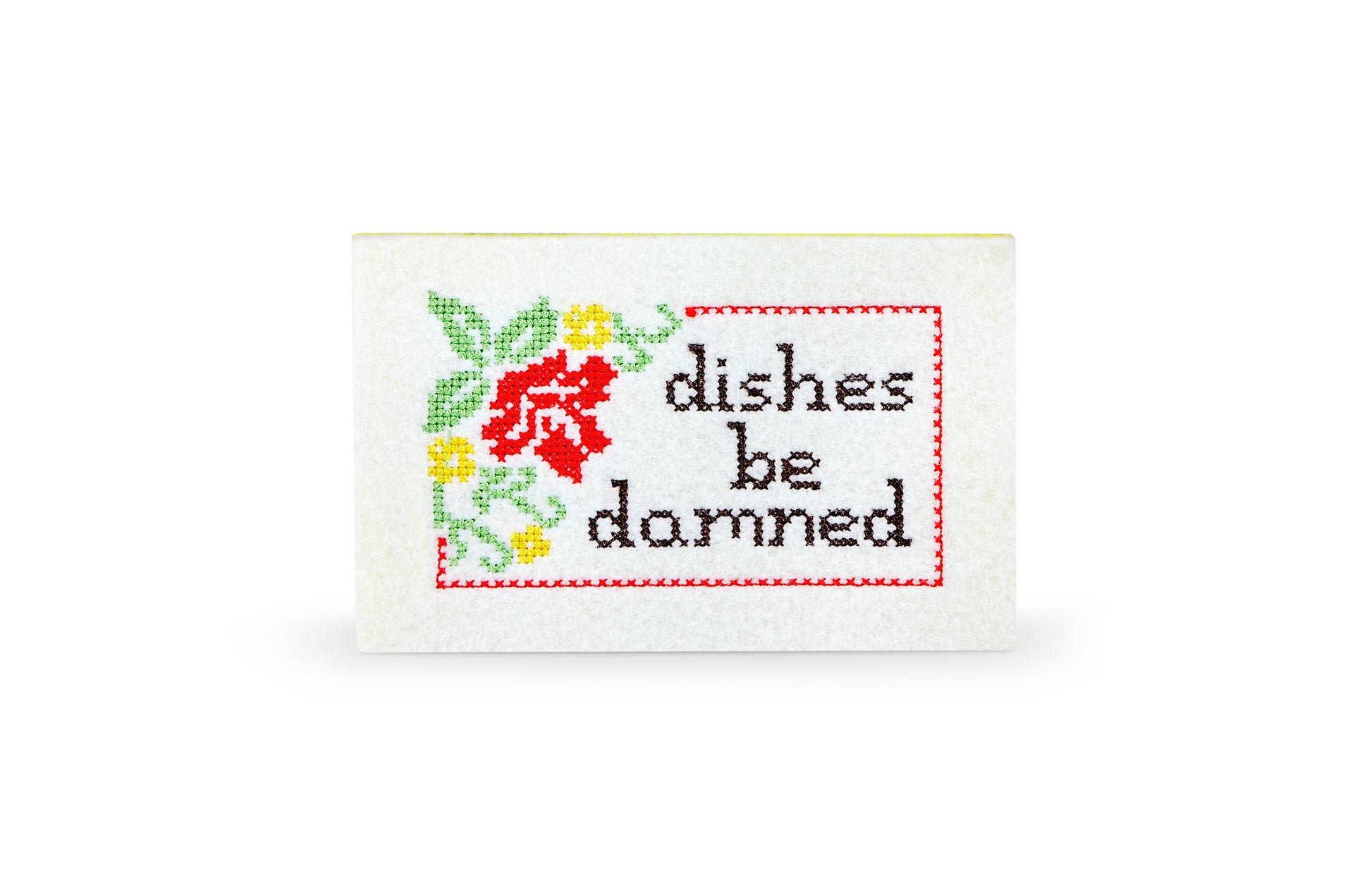 Doing the dishes brings out the surly side in all of us. Show them how you really feel about tedious tasks with Fred's Subversive Sponges. Each set includes 4 unique embroidered poly sponges with a PP gold frame that stands on your countertop or suctions to your sink or tile. Hand wash only. Design by Charlotte Saul from Fred, in cooperation with Subversive Crossstitch.