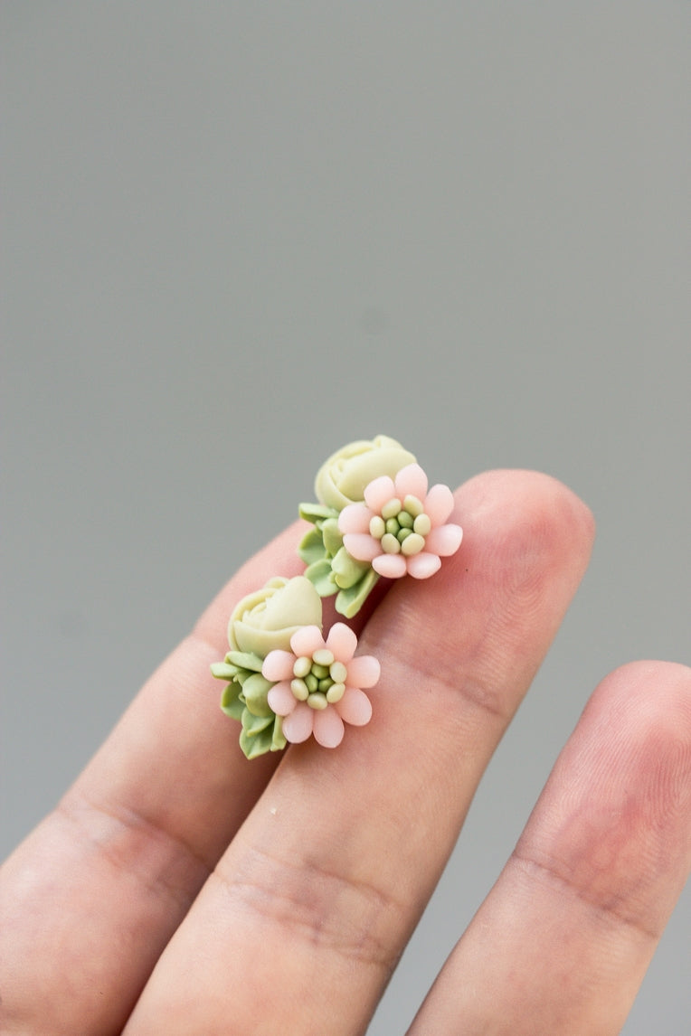 Elevate your jewelry collection with these charming bouquet earrings, meticulously crafted from polymer clay. Each earring features a delightful arrangement of handcrafted succulents and flowers, carefully designed to exude a sense of delicacy and elegance.
