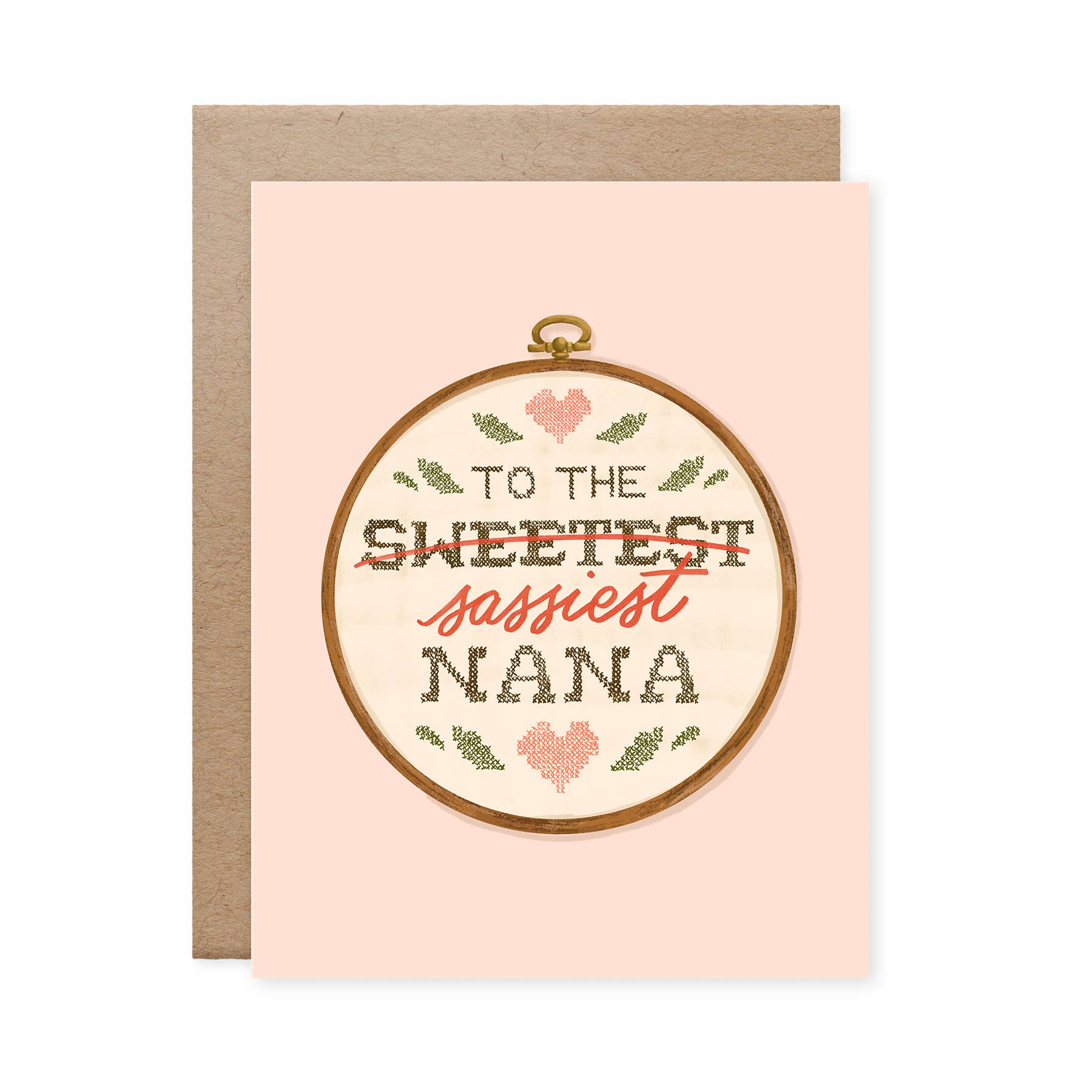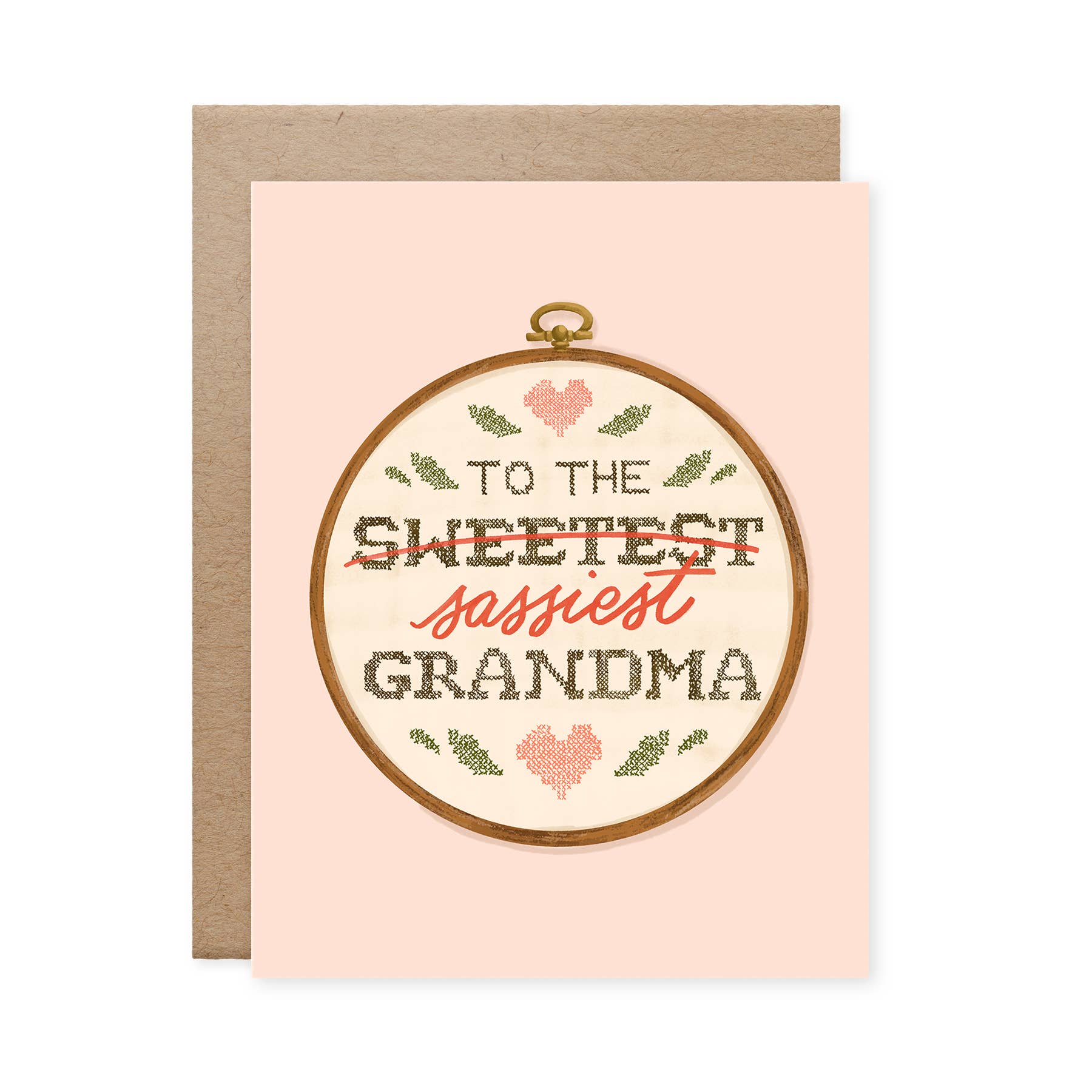 Some grandmas are sweet, and some are sassy! This card celebrates the sassy grandmas with a seemingly sweet cross stitch illustration with a humorous twist.