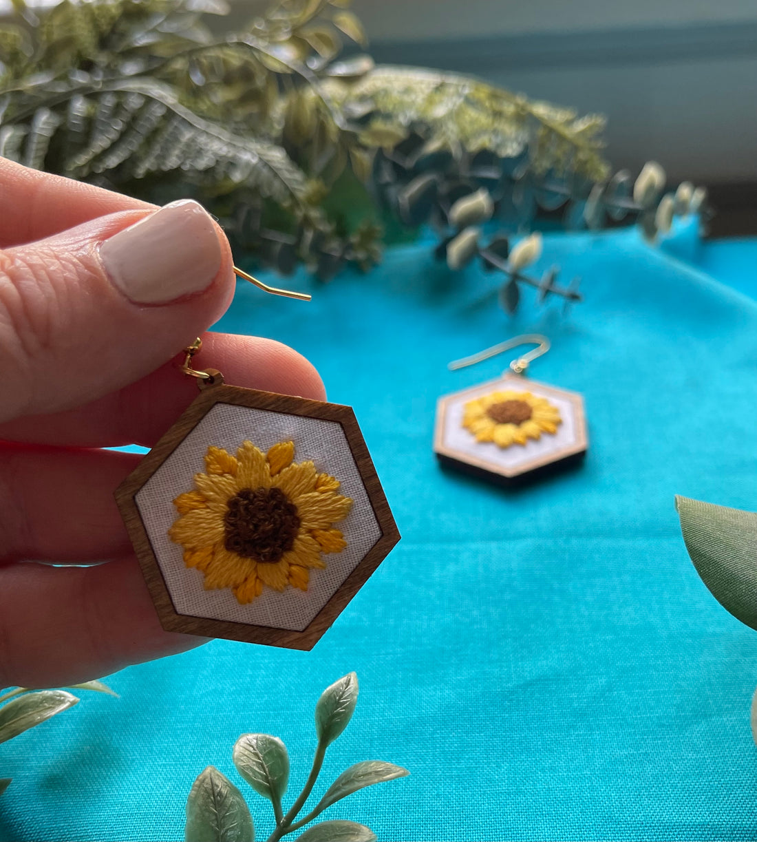 These earrings are made from a hand drawn, original design on upcycled fabric. The petals were stitched with 6-strand embroidery floss. The center is comprised of dozens of french knots stitched with 2-strand embroidery floss to provide a delicate contrast to the petals.