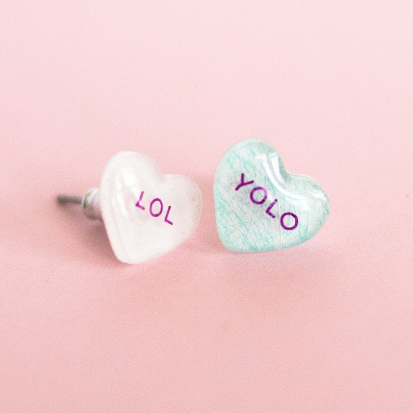 These little conversation hearts feature one light while “lol” heart and one mint-green “yolo” heart. They are very dainty and perfect for a little Valentine's cheer. The hearts are very small, about 1 cm wide. They are made from clear polystyrene coated in resin with medical grade hypoallergenic titanium earring posts and aluminum barrel backs.