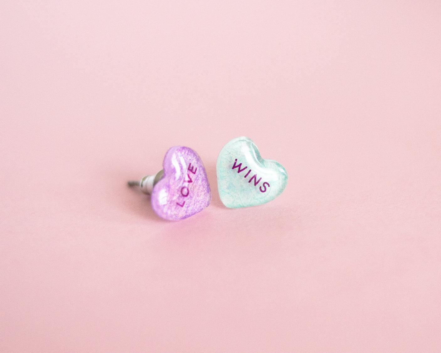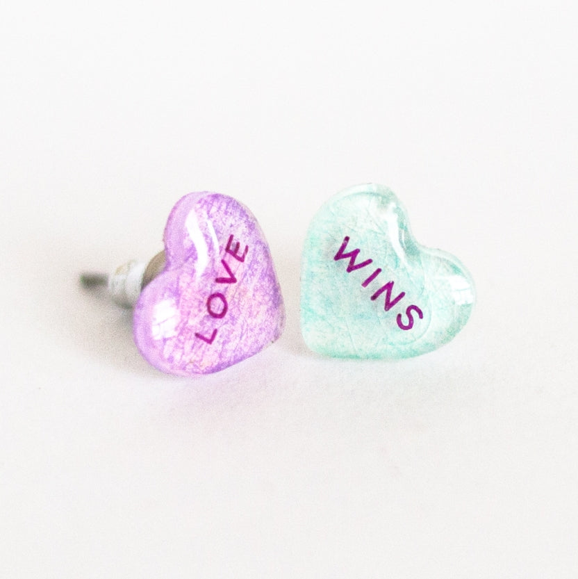 Love wins. These little conversation hearts (or conversation starters) feature one lilac “LOVE” heart and one light teal “WINS” heart. The hearts are very small, about 1 cm wide. Made with hypoallergenic nickel-free titanium earring posts and aluminum barrel backs with rubber cores.