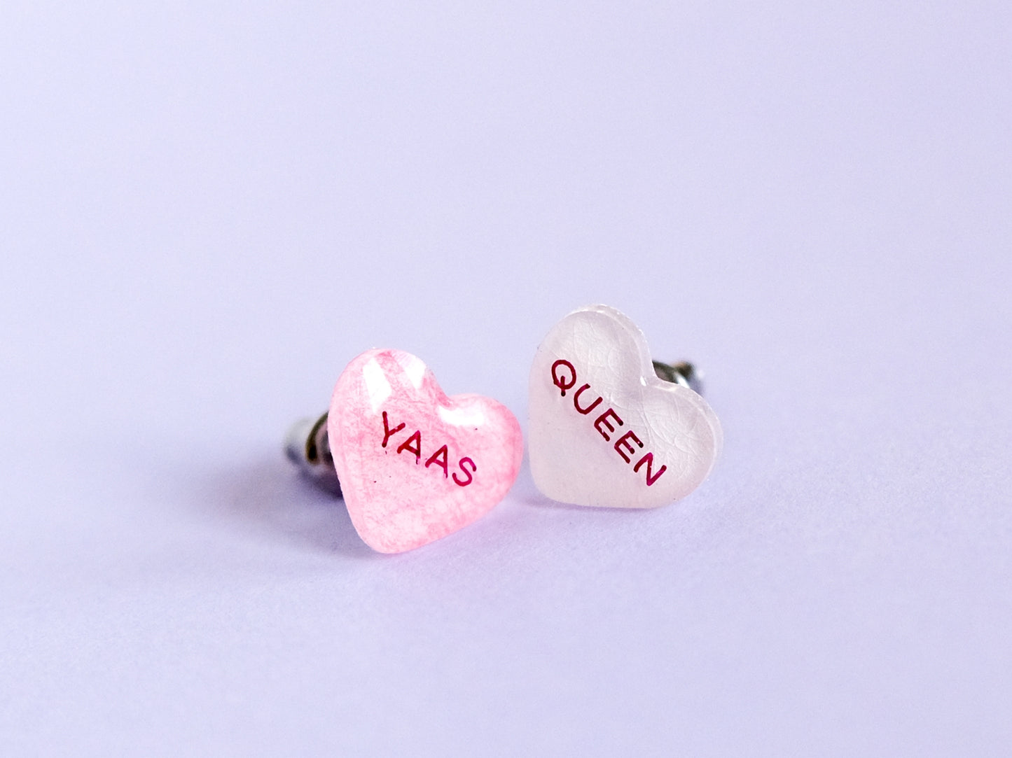 These cute earrings are shaped like classic conversation heart candy and feature the playfully positive phrase "Yaas Queen" in bold letters. Perfect for showing off your sassy side on Valentine's Day. The hearts are very small, about 1 cm wide. Made with hypoallergenic medical grade titanium earring posts and aluminum barrel backs. Each earring is handmade and hand-illustrated, ensuring that no two are exactly alike. The earrings are coated in glossy resin and made with hypoallergenic nickel-free titanium earring posts - perfect for people with metal allergies!