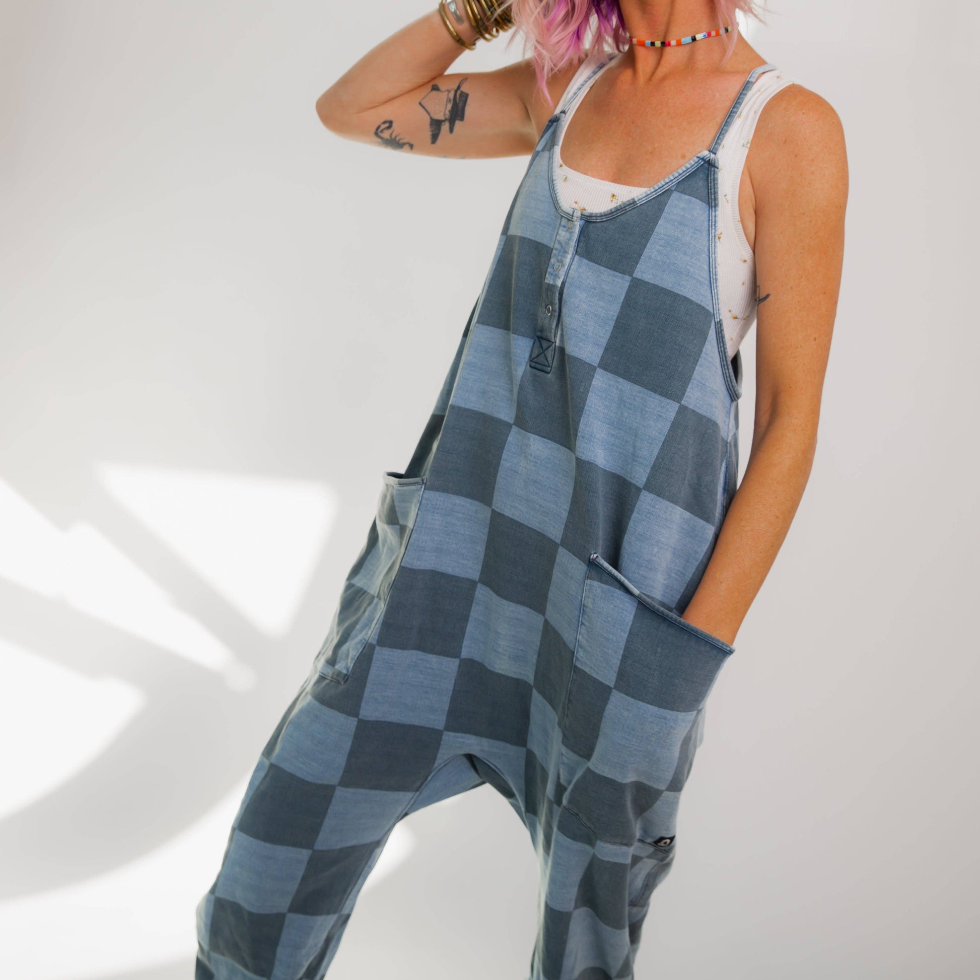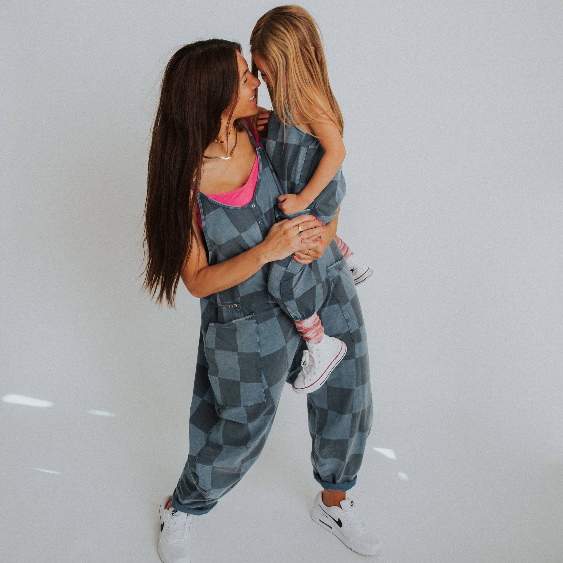 Match your mini-me with our trendy Women's Tank Romper in 'Blue Denim Check.' With a flattering cut and soft fabric, you'll be comfortable and stylish at the same time. Get ready to be the coolest parent around! *Check fade may vary* Our Women's Tank Romper is oversized and runs large. We recommend sizing down. Matching kids version here.