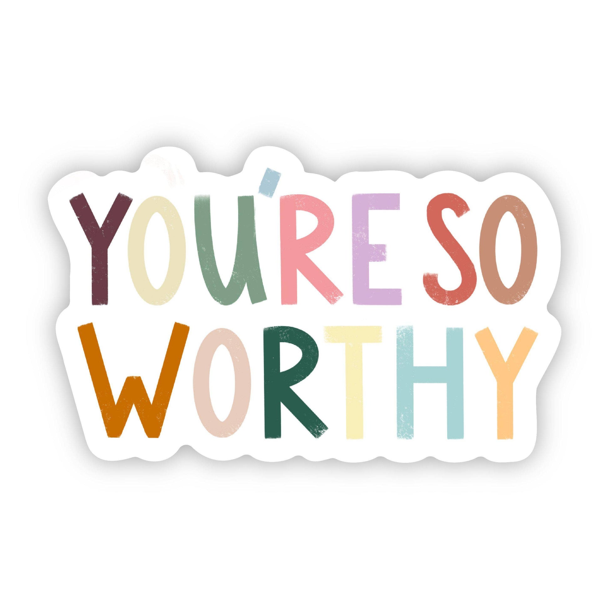 You're So Worthy Positivity Lettering Sticker. Great to decorate water bottles, laptops, phone cases, coolers, car windows, journals, notebooks, planners, bikes, skateboards, kayaks, and more. This positivity sticker can be found in our Positivity Collection, and makes a wonderful gift or positive reinforcement for yourself! Details: •3 x 1.85 inches • Made in the U.S.A. • High quality and durable vinyl, indoor and outdoor use • Waterproof and weatherproof